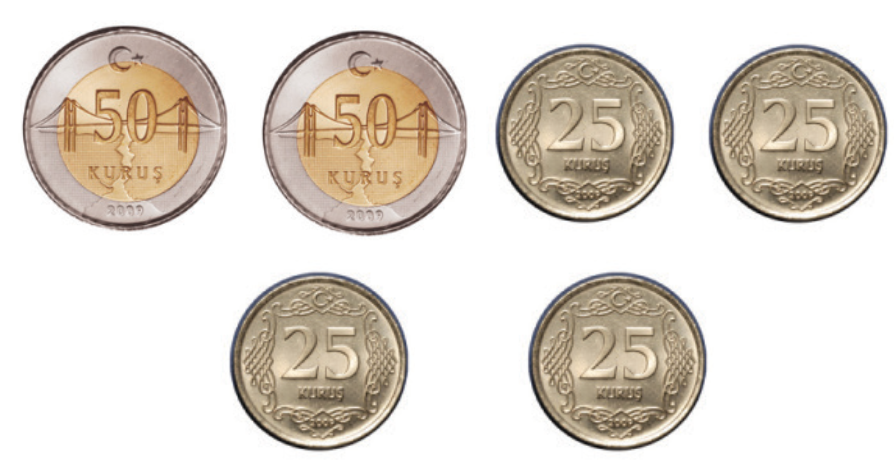 8-) Yukarıdaki paraların toplamı kaç TL'ye eşittir?