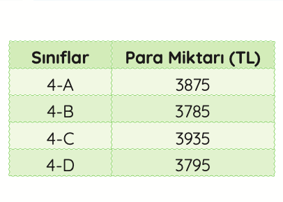 3-) Yukarıdaki tabloda, sınıfların yardım kermesinde topladıkları para miktarları verilmiştir. Buna göre aşağıdaki bilgilerden hangisi yanlıştır?